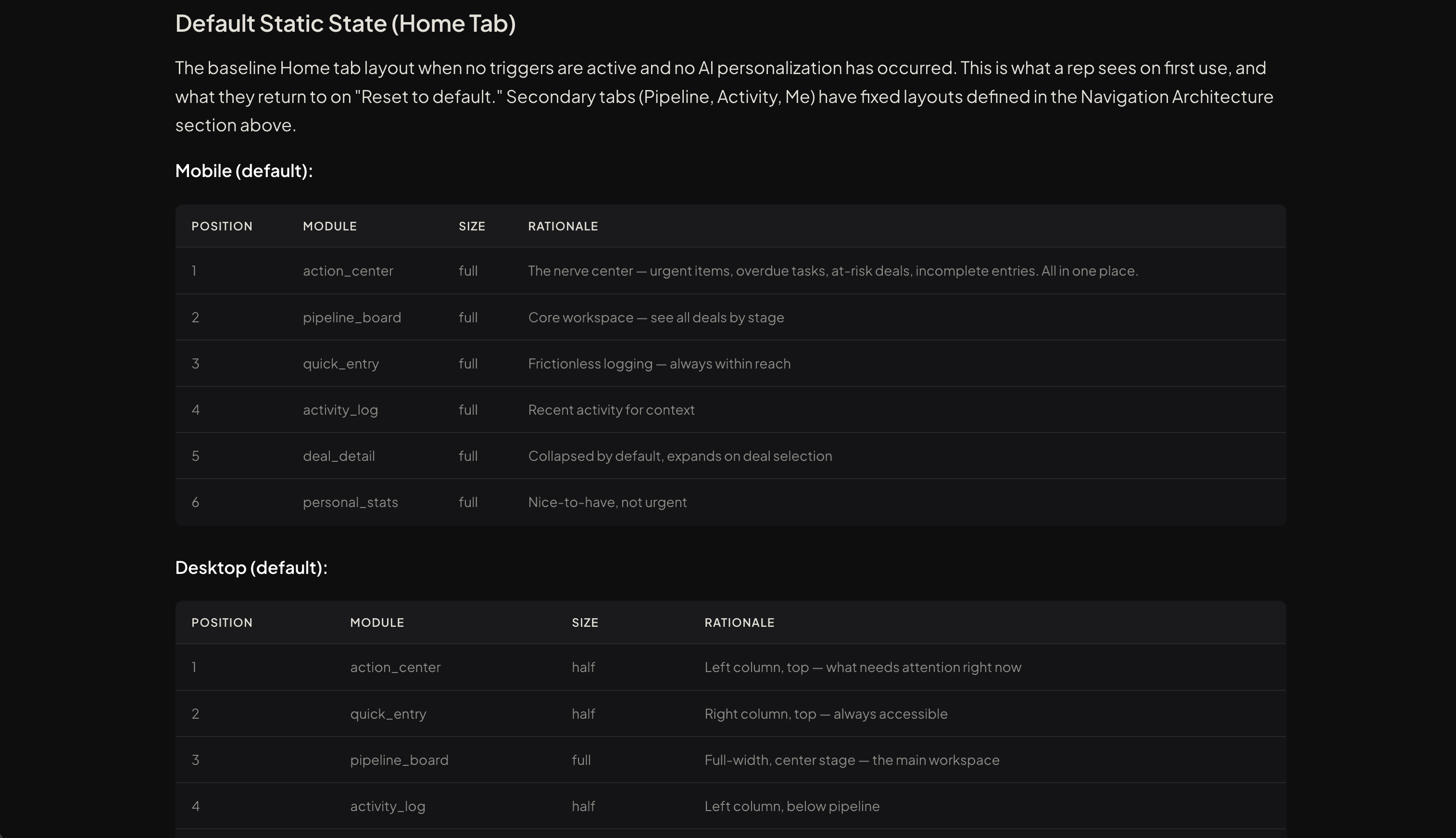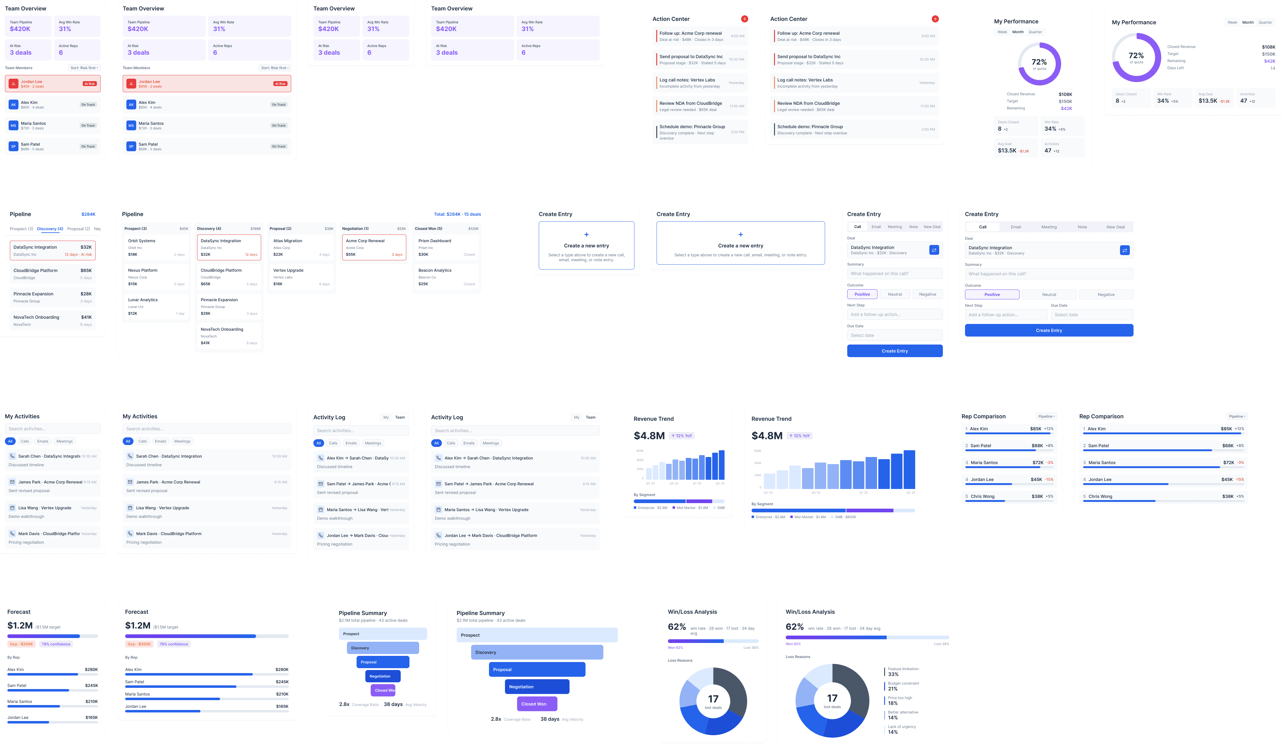 Same components, different roles. The layout changes when users switch between Rep, Manager, and Executive.