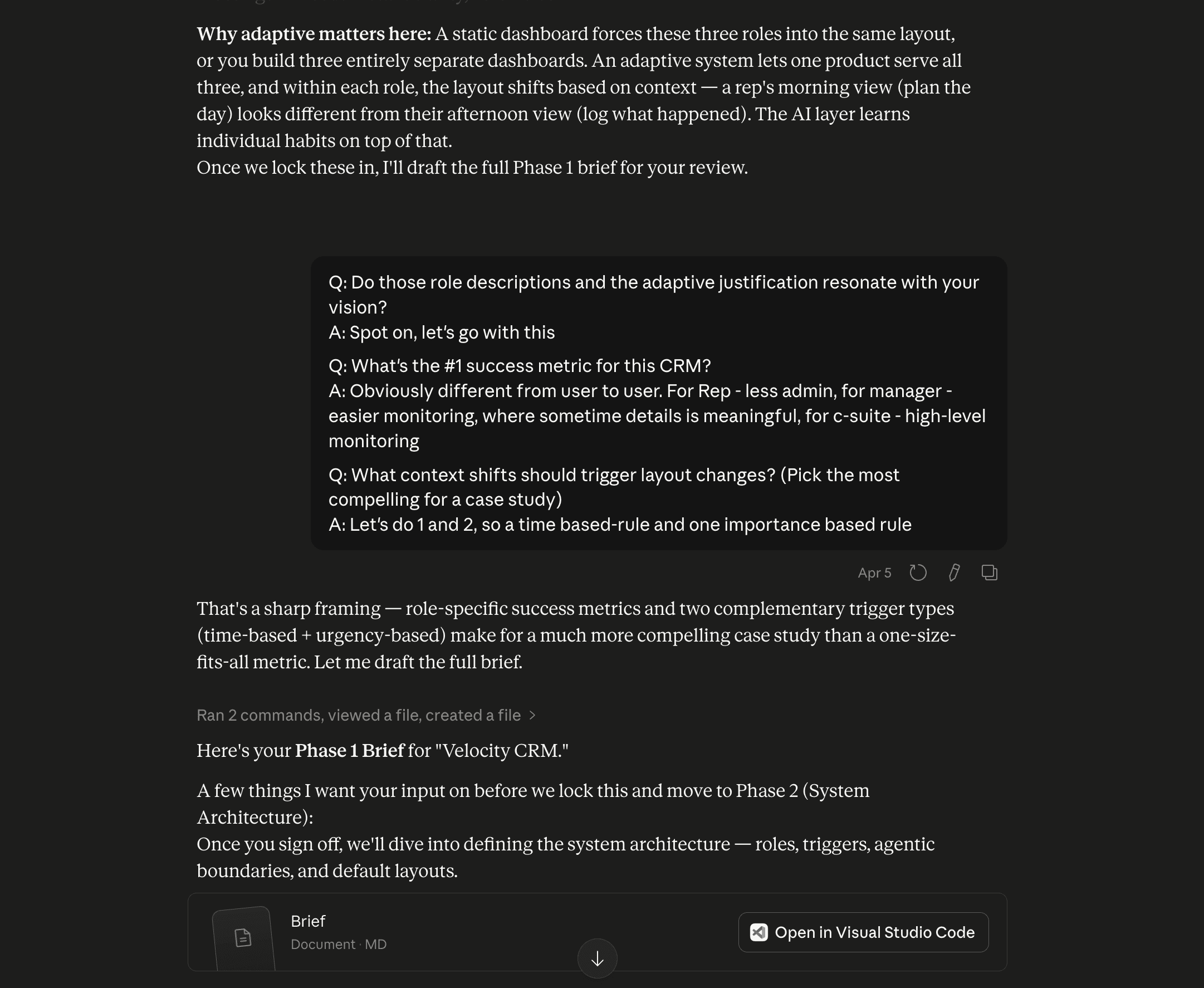I gave AI a rough product direction. It came back with a structured brief covering user profiles, pain points, success criteria, and edge cases. I pressure-tested the assumptions, scoped the project, and locked the direction before moving forward.