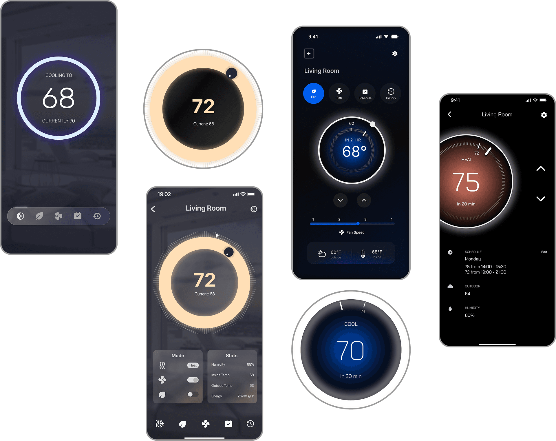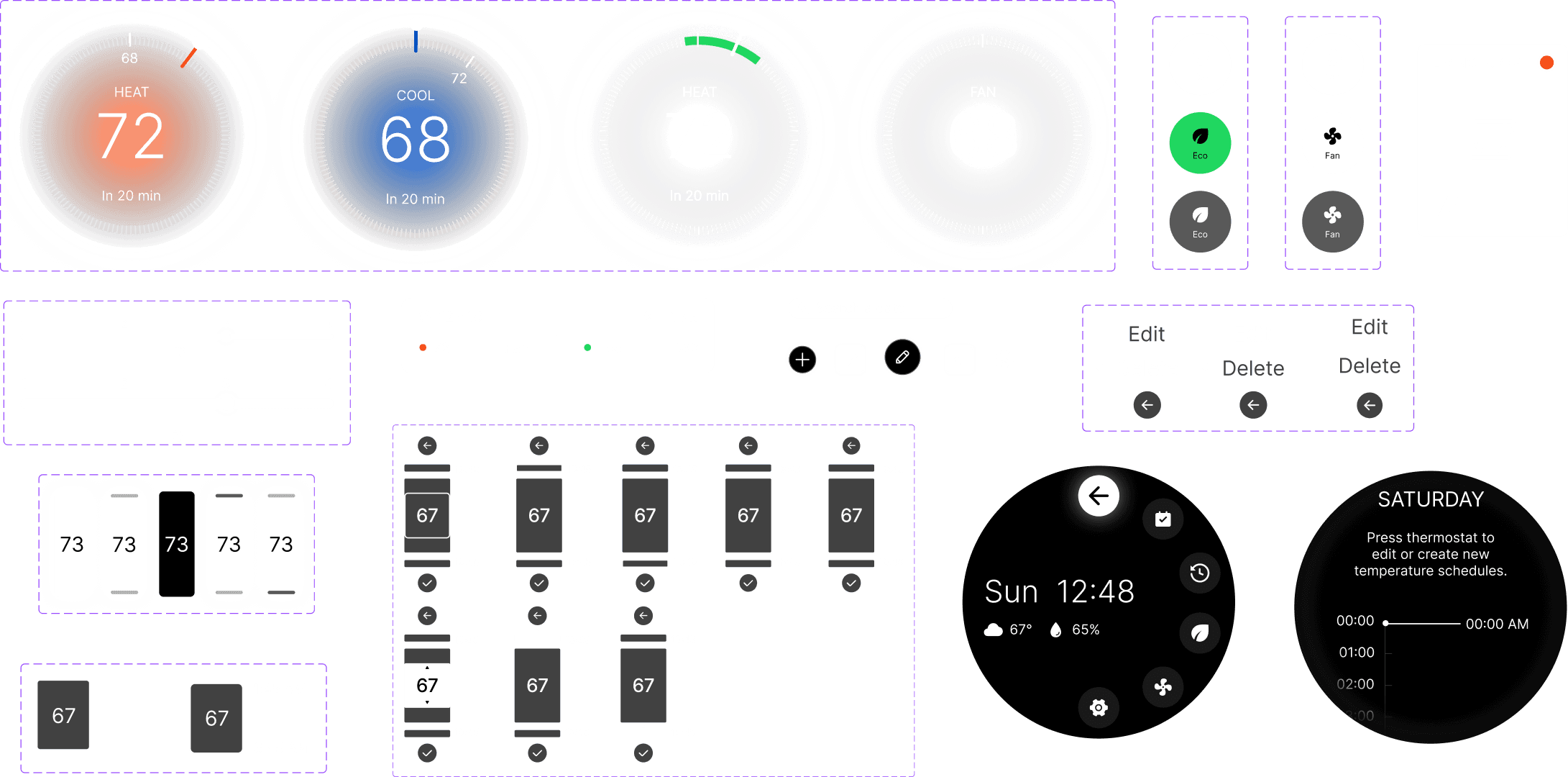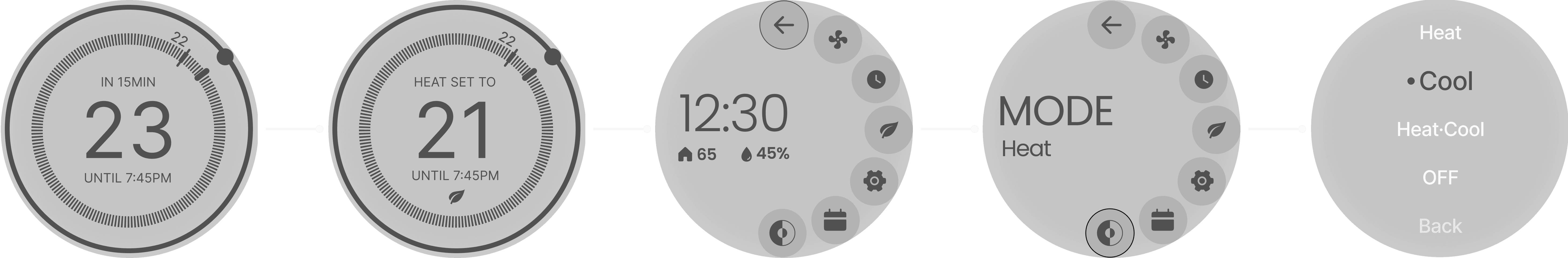 For the thermostat UI, I considered screen brightness, usage context, and the restricted input methods (left/right rotation and press). This balance ensured a premium aesthetic without compromising usability.