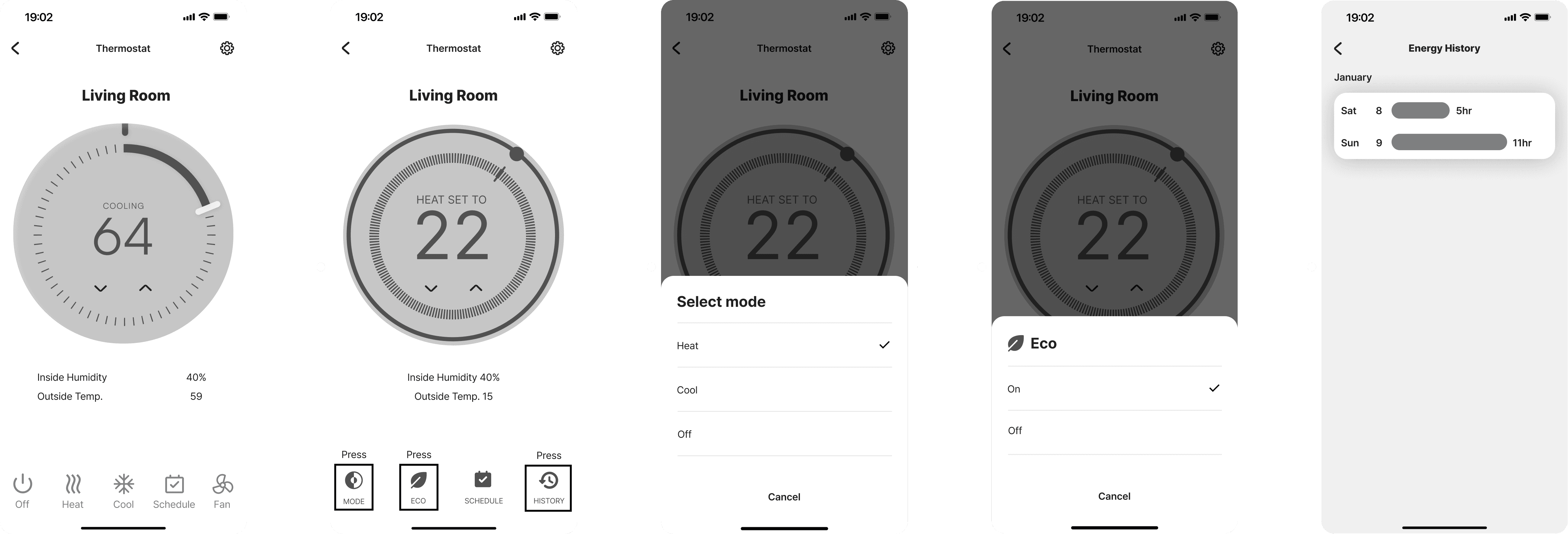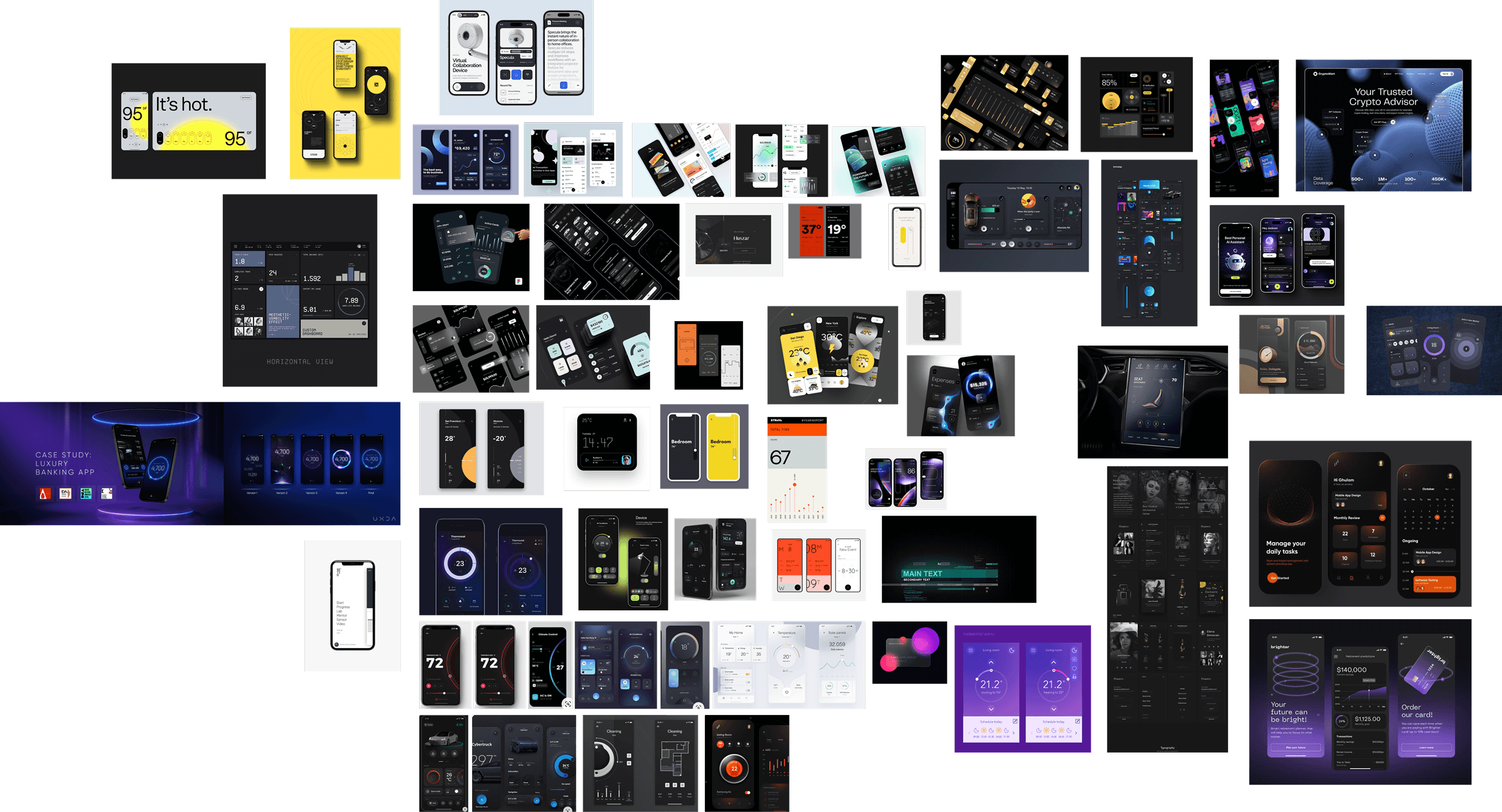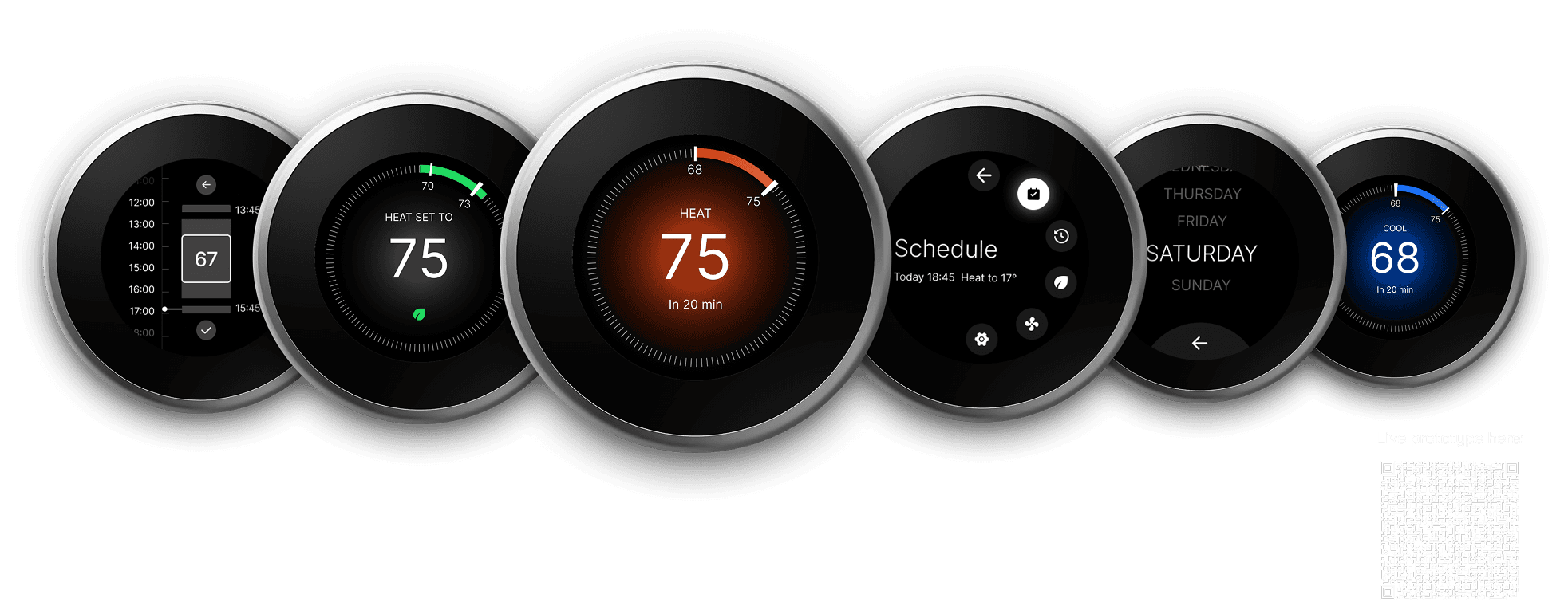For the thermostat UI, I considered screen brightness, usage context, and the restricted input methods (left/right rotation and press). This balance ensured a premium aesthetic without compromising usability.